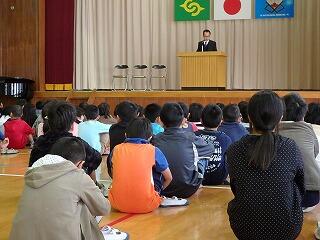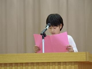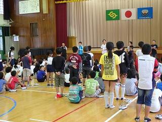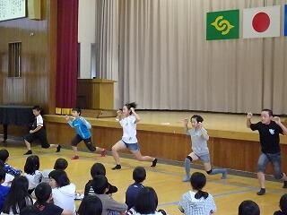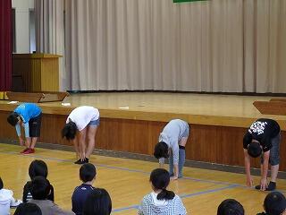 体育委員会が5月に行われた体力テストのA判定者の表彰と5・6年生が朝の会の時間に行っている体操を全校に紹介しました。