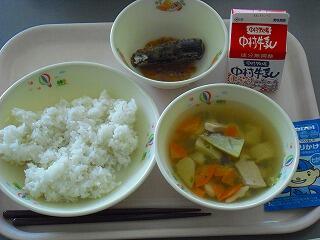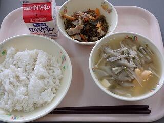 10月29日(木)の給食は、麦ごはん、牛乳、イワシのおかか煮、いもっこ汁、ふりかけでした。