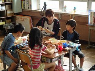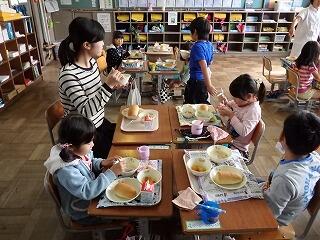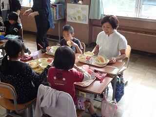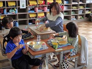 給食の調理員さん、事務室の先生、保健室の先生、音楽の先生の4名の方と一緒に食べました。いつもの給食が何倍もおいしく感じました。