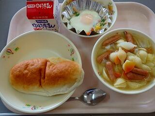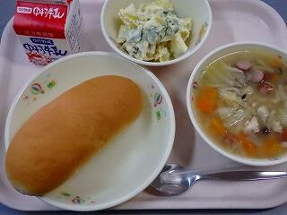 12月2日(水)の給食は、コッペパン、牛乳、ウインナーとキャベツのスープ、スイートポテトのサラダでした。おいもがとても甘かったです。