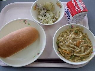 12月7日(月)の給食は、コッペパン、牛乳、カレーうどん、ジャガイモとベーコンのソテーでした。