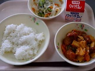 12月11(金)の給食は、麦ごはん、牛乳、酢豚、中華サラダでした。