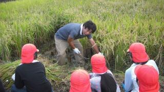 稲の刈り方を、農家の方から教えてもらいます。みんな真剣でした。