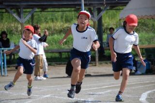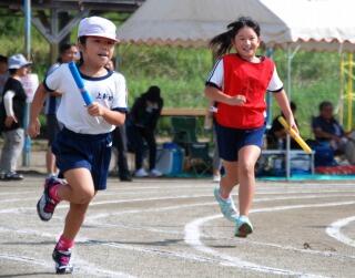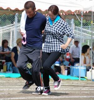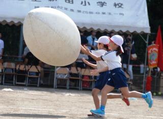 運動会の一場面です。玉ころがしですが、勢いがよすぎて浮き上がっています。
