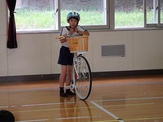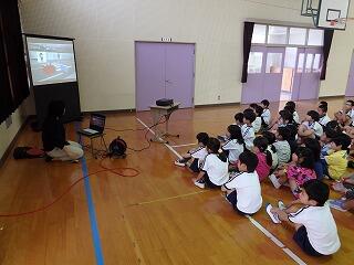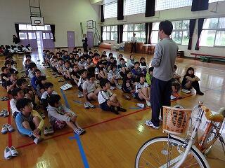 4月25日(火)の朝の時間に、講堂で交通安全学習を実施しました。1~3年生は、スクリーンに映し出された校区内の危険か所を確認した後、横断歩道を渡る練習を行い、4~6年生は、自転車の安全な乗り方について、実際に自転車を使って学習を行いました。