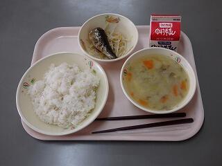 この日のメニューは、麦ご飯、さつま汁、いわしの梅煮、ゆでもやしでした。とてもおいしくいただきました。