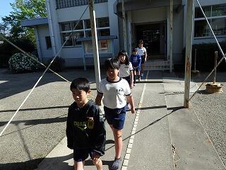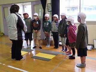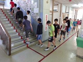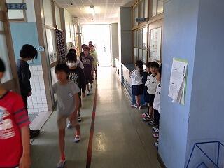 まず、6年生の子ども達が、お手本として他の学年の教室の前を歩きました。その後、各学年で特別教室や講堂等への移動の練習をしました。