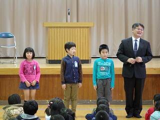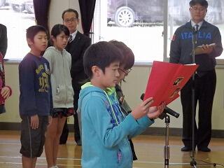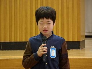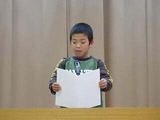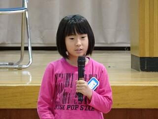 子ども達の作文発表では、1・3・5年生の代表の子どもが、1年間の思い出や3学期に頑張ったことなどをステージの上で発表しました。