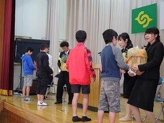 離任される先生方のお別れの言葉では、1~7年間の本校在籍中の思い出や児童へのメッセージが熱く語られました。児童代表お別れの言葉では、5年児童2名が、時折涙を流しながら4名の先生方へ感謝の気持ちなどを伝えました。その後、PTAが準備してくださったお花を代表児童が贈呈しました。