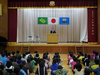 校長先生のお話では、学校の教育目標である「よく学び 心やさしく たくましく すすんで働く上新田っ子」について、子ども達に自己評価をさせました。また、2つの合い言葉である「凡事徹底」はできているか、「自分もOK 相手もOK」については、人への思いやりの態度ができているかを振り返らせました。最後に、春休みは次の学年への準備の期間だということを確認した上で、お互いの頑張りをたたえて、みんなで拍手をしました。