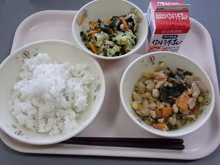 9月29日(火)の給食は、麦ごはん、牛乳、大豆のごもく煮、たこの酢の物でした。ヘルシーメニューです。