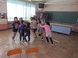 説明会を行っている間、3年生と新入児の交流活動を行いました。「読み聞かせ」「クイズ」「ジャンケン列車」「ダンスと歌」など、この日のために3年生が一生懸命準備をしてきました。11名の新入児も、笑顔いっぱいの活動となりました。