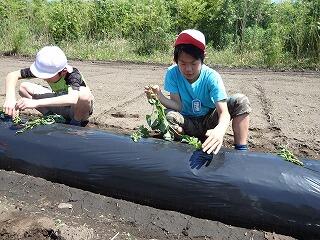 3年生 ①大豆の種まき ②さつまいもの植え付け