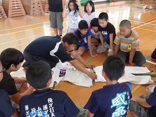 9月28日(木)に、5年生の子ども達が講堂でかかしを作り、イートン田んぼに設置しました。このかかしは、竹を切り出し、針金やひもでしばって骨組みを作り、子ども達が家から持ってきた材料(いらなくなった服、ひょっとこのお面、麦わら帽子など)を使って作りました。