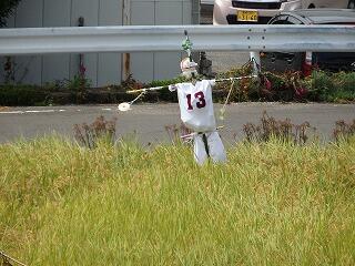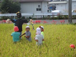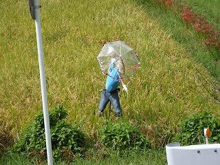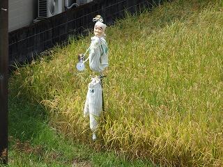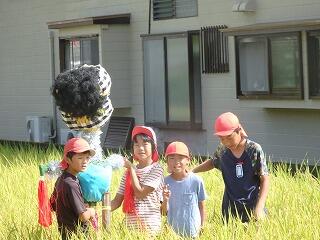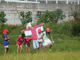 9月29日(木)に、5年生の子ども達が、イートン田んぼにかかしを設置しました。写真を見ていただければ分かりますが、なかなかの力作のかかしです。