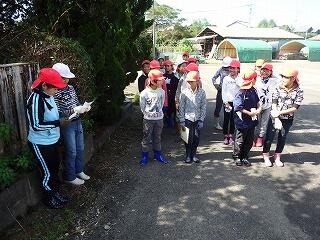 1年生 ①花だんにコスモスを植えています。②畑にエダマメを植えています。