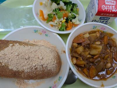 今日の給食は、きなこあげパン、牛乳、ポークビーンズ、花野菜サラダでした。