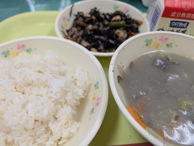今日の給食は、麦ごはん、牛乳、ひじきの五目煮、ぼたん汁、ミルメークでした。