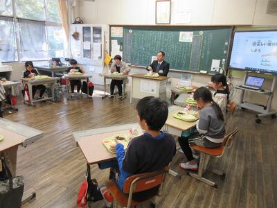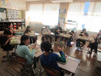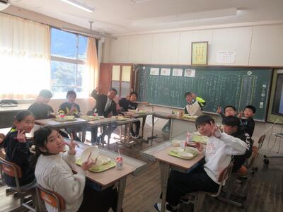 今日の給食は、日頃お世話になっている方々をお招きした「招待給食」でした。 西米良村長をはじめ、教育委員会の皆様、そして毎日朝早くから美味しい給食を作ってくださる調理員さんをお迎えし、各教室で一緒に机を囲みました。