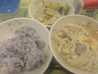 今日の給食は、ゆかりごはん、牛乳、たまごとじうどん、ブロッコリーのごま和えでした。
