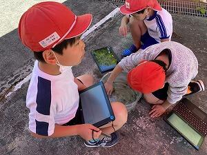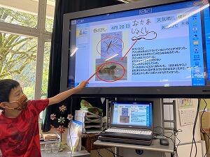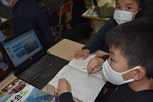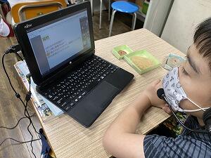 タブレット上で配付された資料をもとに学習します。おうちの方と相談しながら学習を進めました。