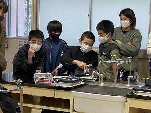 中学2年生は理科の授業。電気の性質についての実験をしていました。複雑な計算をしながら、グループで分担し素早くプリントにまとめている姿に6年生も驚いていました。