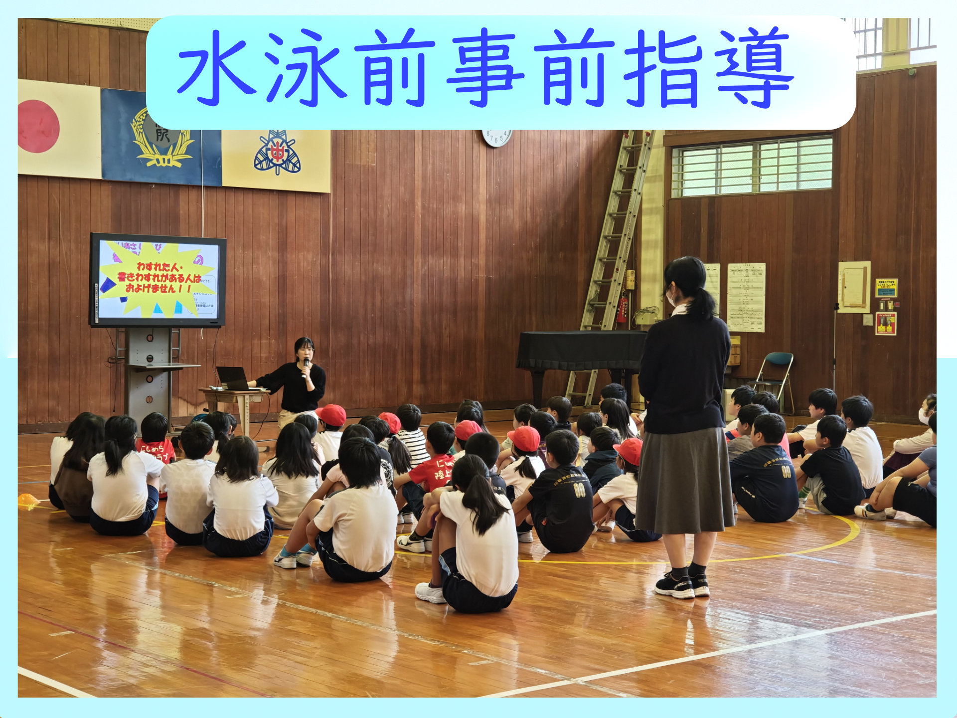 水泳の授業を安全かつ充実したものにするために、朝の時間に全学年合同で事前指導を行いました。