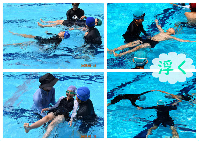 背浮きを試す場面では、最初は緊張した表情を見せていた子どもたちも、少しずつ水に慣れ、笑顔で「浮けた!」と嬉しそうな声を上げる姿が見られました。友達と手をつなぎ合って支え合う姿からは、仲間とともに学ぶ温かさも感じられました。