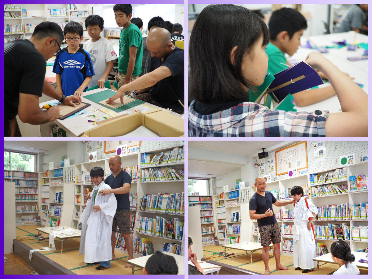 御幣作りでは、紙を折り、形を整える作業を体験しました。白張りの着付けでは、代表の児童が実際に衣装を身にまとい、手順や着方を学びました。子どもたちは、自分の手で伝統の品を形にする喜びを感じている様子でした。