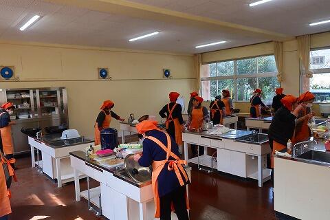 調理時間、ごはんを配缶する人、みそ汁を作る人、揚げ物をする人、揚げた椎茸や鶏肉を南蛮酢にからませ個数を数えて配缶する人、添え野菜を和える人…と調理員さん、栄養教諭の5人体制で作業を進め、時間もかかり、大変な作業が続きましたが、給食時間の「とってもおいしい!」の声に、疲れが吹っ飛んでいきました。