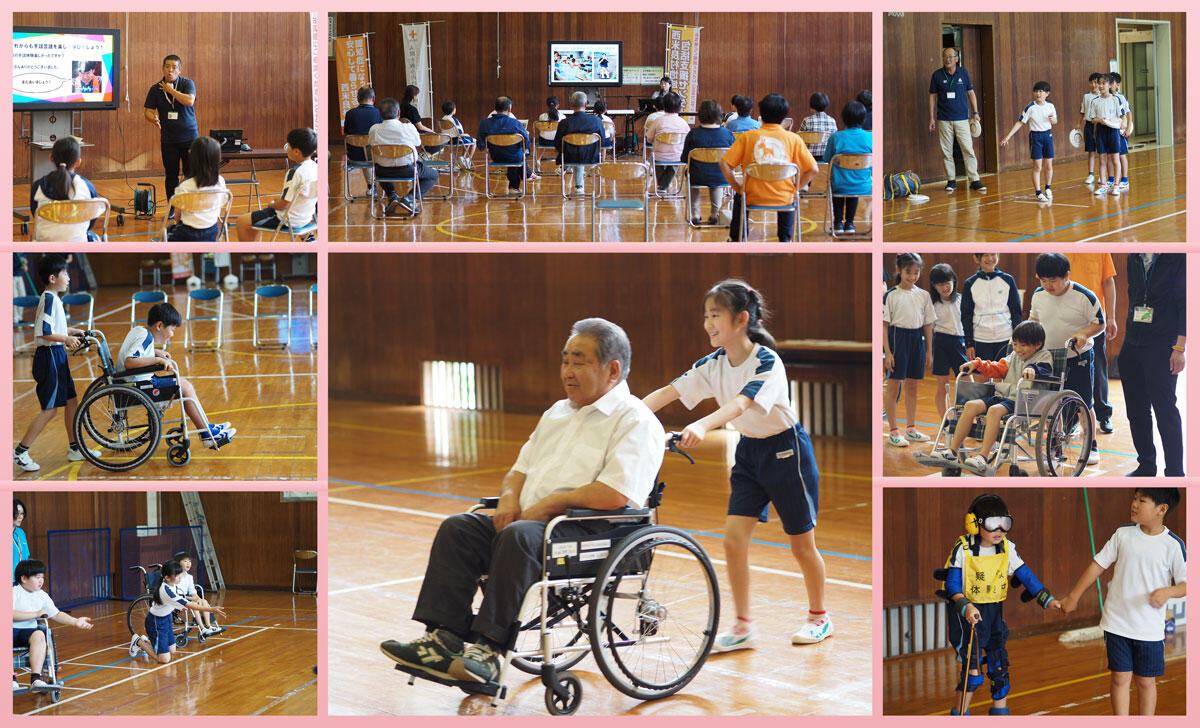 車いすを操作してみた子どもたちは、ちょっとした段差の大変さや方向転換の難しさなどを実感していました。また、手話体験では、言葉が通じなくても心を通わせる方法があることを学びました。高齢者疑似体験では、体の動きに制限がある中で日常生活を送る難しさを体感することができました。