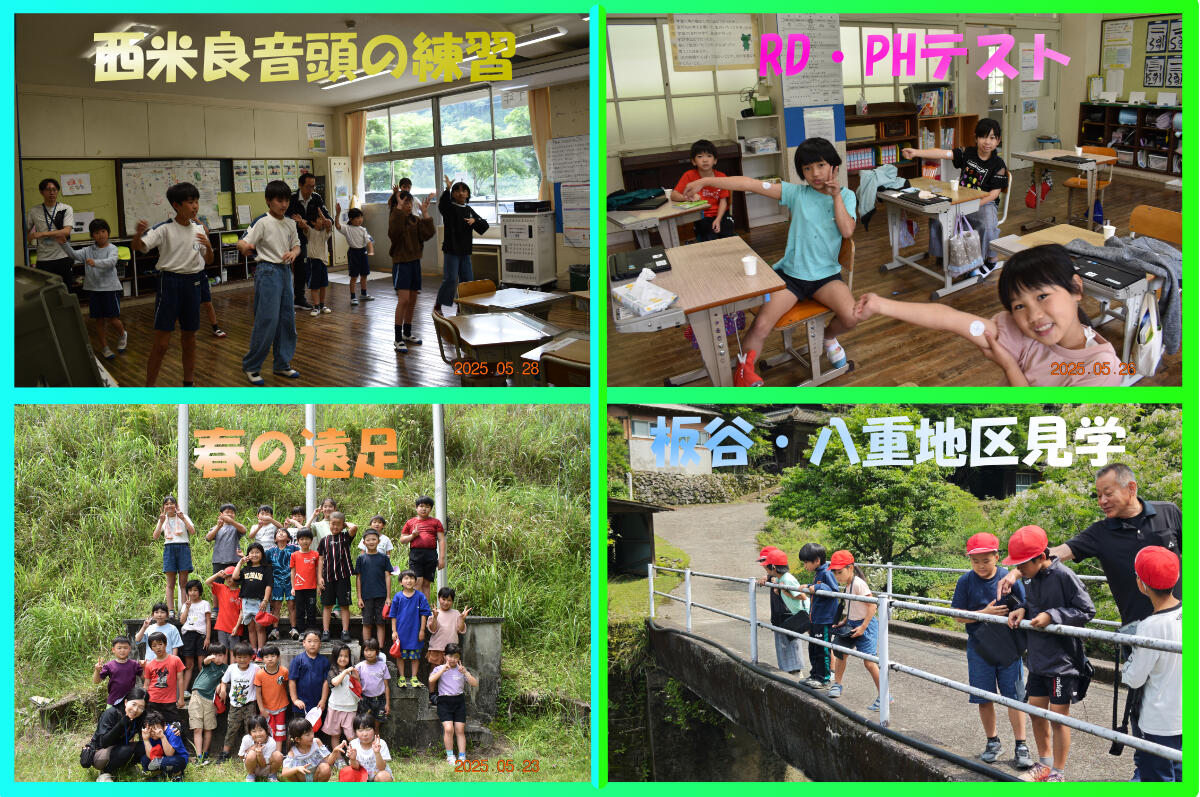 新緑のまぶしい季節となりました。子どもたちは元気いっぱいに、さまざまな活動に取り組んでいます。今回は、「春の遠足」「西米良音頭の練習」「RD・PHテスト」「板谷・八重地区の見学」についてご紹介します。