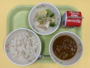 麦ごはん、チキンカレー、フルーツクラッシュ