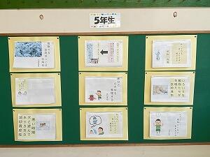 玄関の掲示板には、ICTを活用してまとめられた子どもたちの作品が掲示されています。