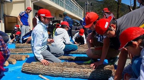 椎茸の駒打ちの作業を全校児童で体験。