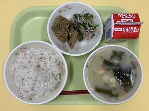 減量いりこ菜めし、鮭の塩焼き、チーズチキン大葉巻、切干大根入り厚焼き玉子、ポテト、マカロニサラダ、ミニトマト、ぶどう、セレクトデザート、牛乳