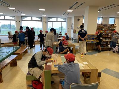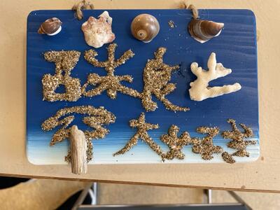 「子供のくに」内にある「青島アクティビティセンター」です。砂や貝、流木などを接着剤で板に付けて、オリジナル表札などを作りました。