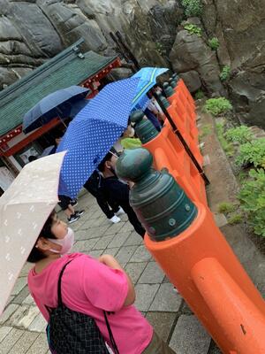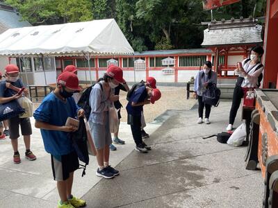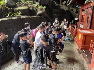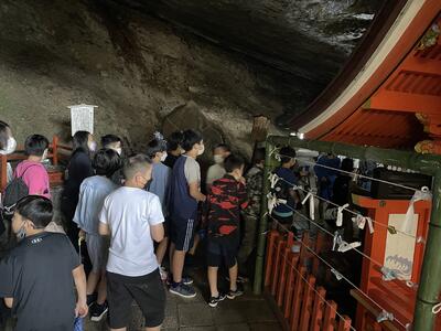洞窟内では、本殿、豊玉姫が山幸彦との子どもを産んだ場所、お乳岩、お乳水など、ガイドさんが子供たちにわかりやすく説明していただきました。運玉投げは、何人か入ったようで、歓声が上がってました。