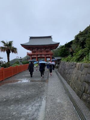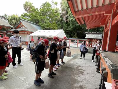 青島神社では海幸と山幸の神話を聞き、参拝後、ビロー樹を見学しました。