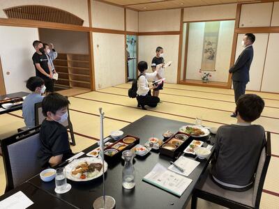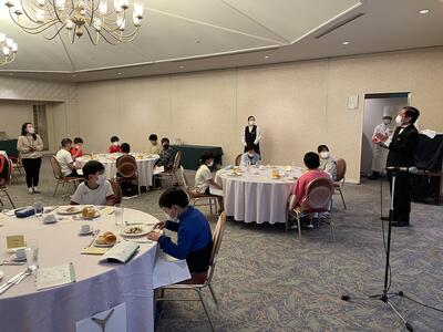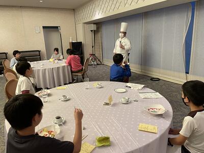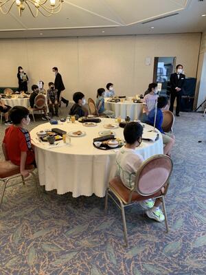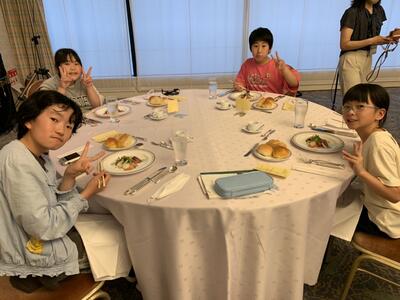 コンベンションセンターに移動して、貸し切り会場での食事です。前菜、スープ、魚、肉(ハンバーグ)、パン、デザートなどフルコースでした。担当の方からナイフとフォークの使い方を教えていただき、最初は少し緊張して食べました。パンがおいしいとのことで、1人6個食べた子供もいました。料理長がお越しになり、料理の違いなどを話していただきました。