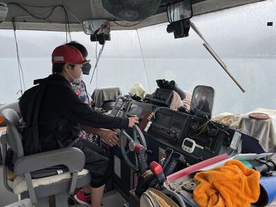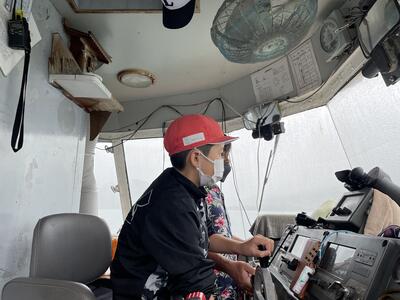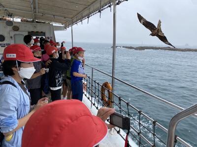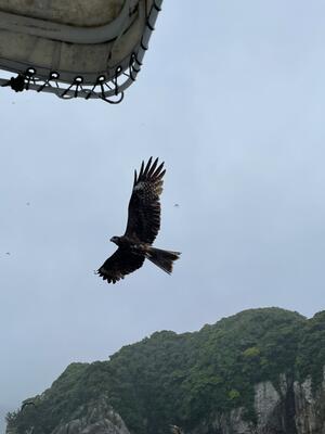 船上ではトンビのエサやりがあり、これまた目の前まで寄ってきて、サッとエサを取っていく様子に歓声が上がってました。船の操縦もさせていただきました。