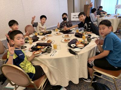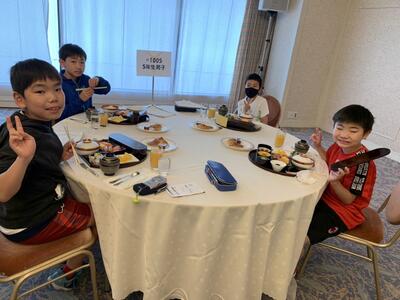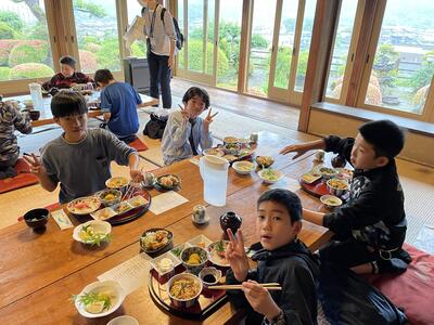子供たちは、朝は部屋の中から、日の出を見て、今日も元気です。朝食は、ご飯やクロワッサンをおかわりする子供もいました。