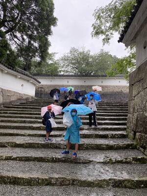 小雨の合間に記念撮影。昼食は庭園を眺めながら飫肥寿司、飫肥天、厚焼き卵、デザートなど上品なメニューを美味しく食べました。これから飫肥の街を各班で散策します。