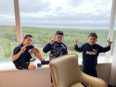 ホテルでは、部屋も食事会場もオーシャンビュー。食事会場は、貸し切りです。みんな控えめ会話で、豪華メニューを静かに食べてます。昼食の宮崎牛がまだ消化しきれてないのか食べきれない子供が多いです。