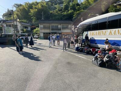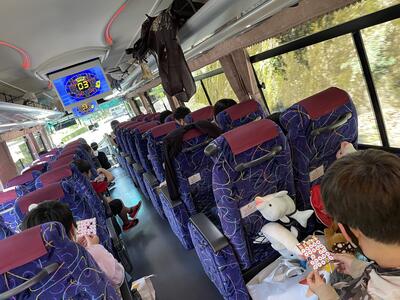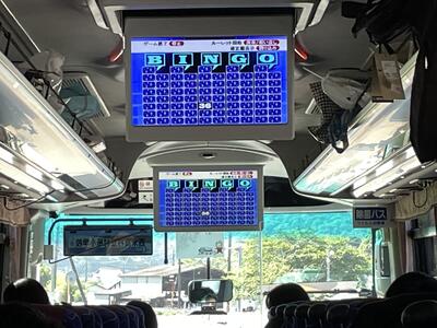 さぁこれから山道です。今出発しました。バスの中では、りさ先生、さおり先生企画のビンゴ大会が始まりました。