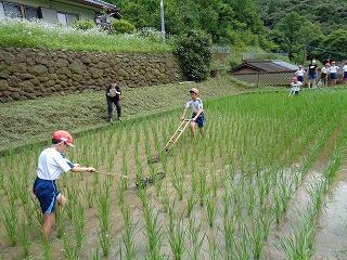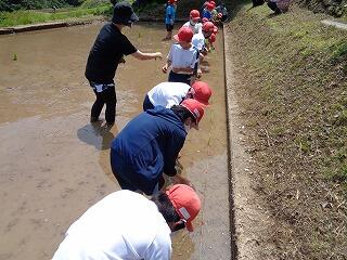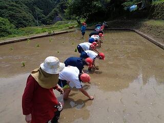 5・6年生合同で、地域のアグリスクールの方々にご指導いただきながら、田植えを行いました。餅米の苗を、印に沿ってうえていきました。6年生は2回目の活動、5年生は初めての活動でした。秋に収穫した餅米で、餅つきを行う予定です。