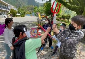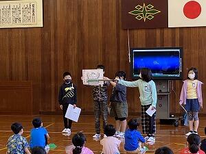 養護教諭のまなみ先生が監督・脚本、栄養教諭のけいこ先生が女神役と、先生方も工夫を凝らし、楽しく活動できました。