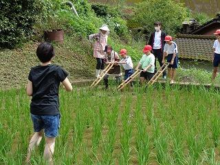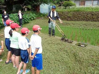 6月に田植えをして1ヶ月、今回は田んぼに出かけ、草取りをしました。今回もアグリスクールの皆様に、草取りの仕方を教えてもらいながら、回転式除草機を使って、草取りを交代でやっていきました。スムーズに進む子、なかなか進まない子、それぞれでしたが、楽しく活動していました。