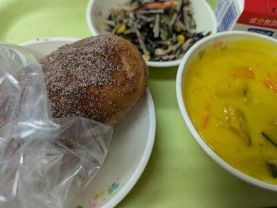 今日の給食は、ココア揚げパン、牛乳、かぼちゃポタージュ、ひじきとごぼうのサラダでした。