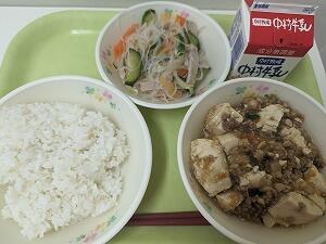今日の給食は、麦ごはん、牛乳、マーボー豆腐、春雨の酢の物でした。